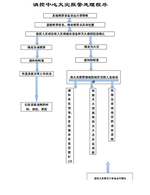 4、如果确认是真实火灾,则立即通知消防控制中心值班人员立即确认火灾报警控制器是否在自动状态,如果在手动状态,需立即将报警控制器转至自动状态,并拨打119报警,上报单位领导,在单位领导的指挥下启动消防应急预案,组织人员进行灭火和疏散逃生,视情况启动相应的消防联动设施,密切监视设备运行情况并做好记录。